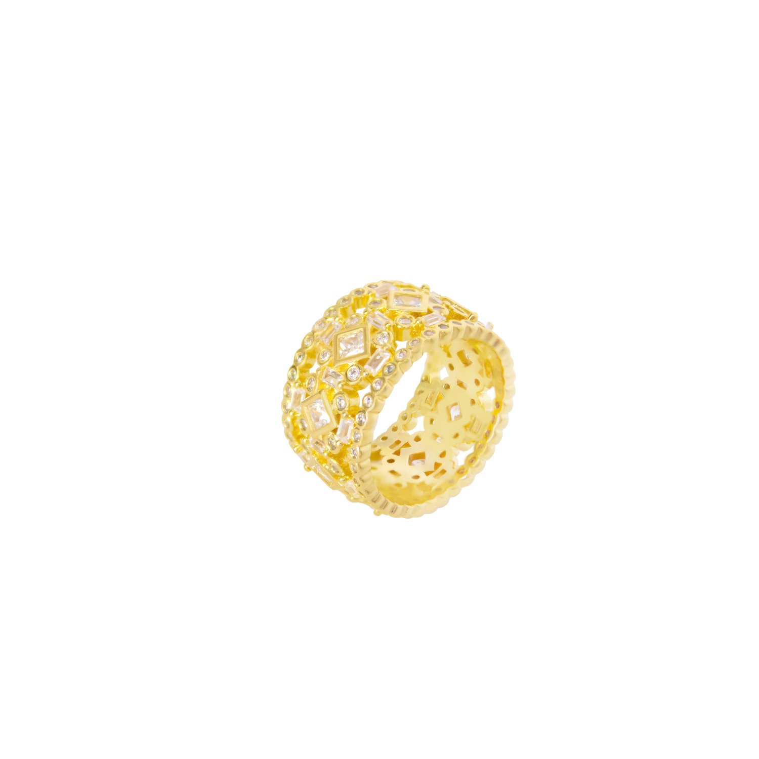 Este anel largo banhado a ouro 18K é um símbolo de sofisticação e elegância. Cravejado com micro zircônias, zircônias navete e zircônias quadradas, ele é perfeito para quem deseja uma peça de destaque. O acabamento cravejado e os milésimos de ouro 15 garantem a durabilidade e o brilho do anel, que pode ser usado em ocasiões formais ou como aparador de alianças, combinando perfeitamente com solitários ou anéis mais finos.