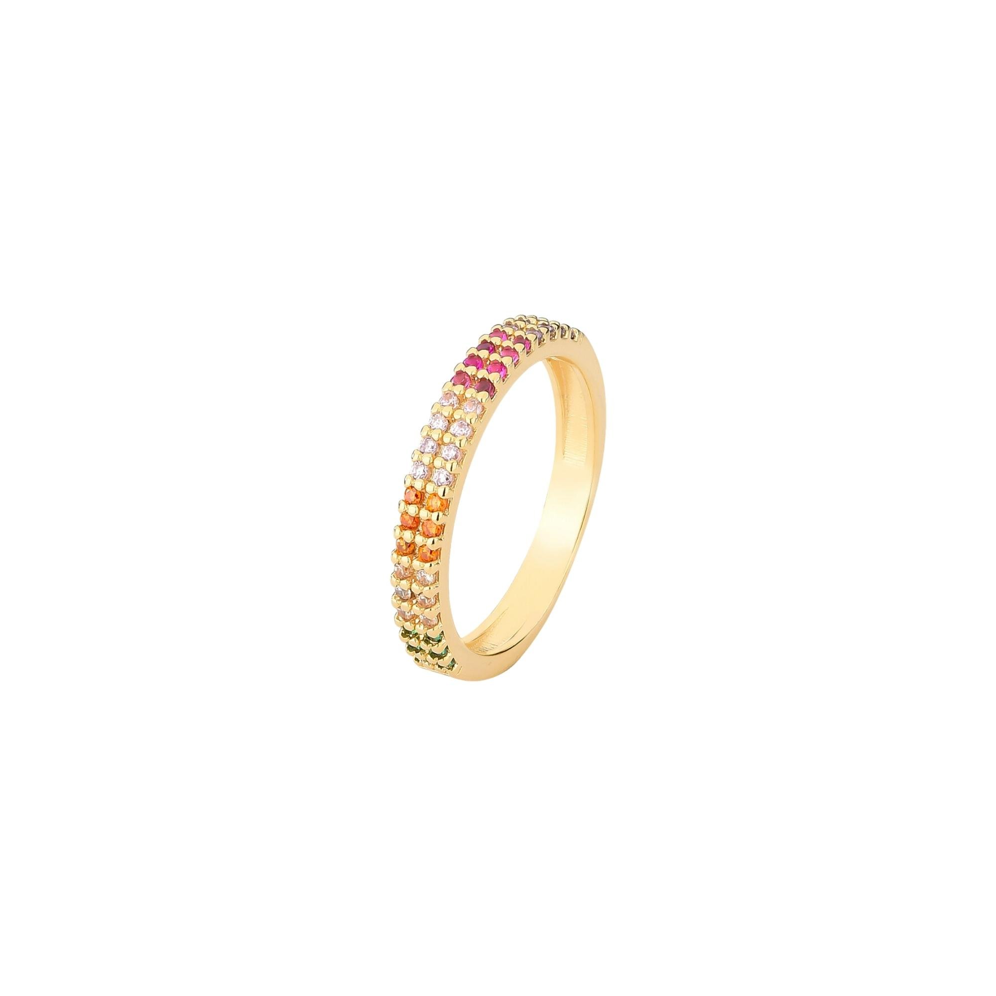 Este anel elegante traz a beleza das zircônias coloridas em duas fileiras, combinando sofisticação e modernidade. Ideal para dar um toque vibrante e especial ao seu visual.