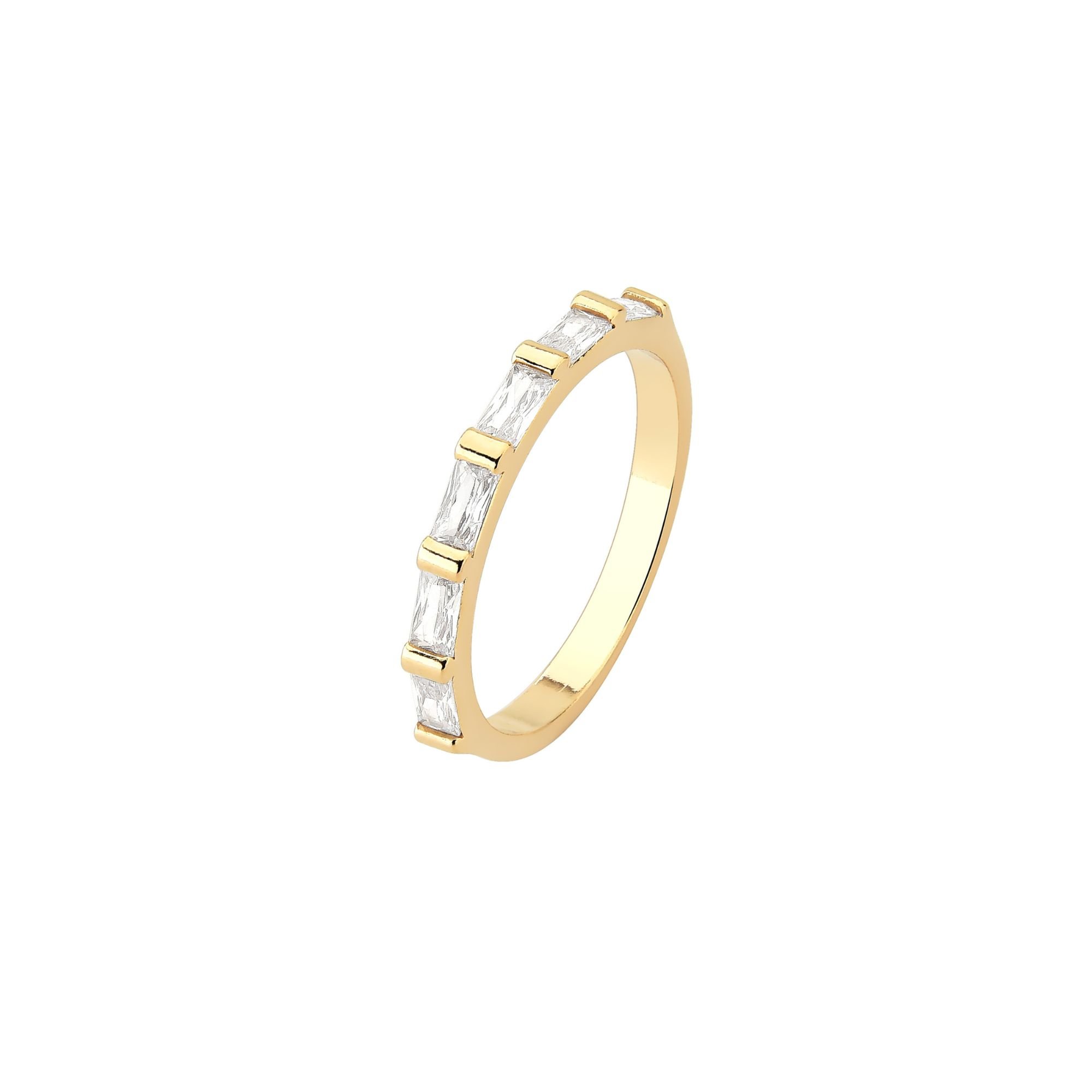 Anel com Zircônia Baguete - Banhado a Ouro 18K Sofisticação em cada detalhe. Este anel destaca-se pela cravação de zircônias em lapidação baguete, que proporcionam um brilho linear e moderno. Banhado a ouro 18K, é uma joia refinada e atemporal, ideal para compor produções elegantes com leveza e estilo.