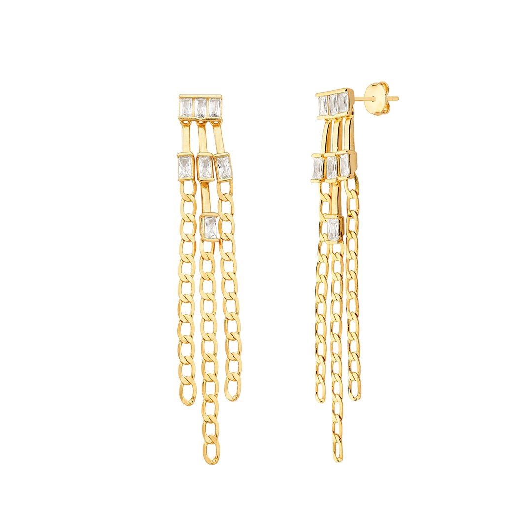 Este brinco banhado a ouro 18K apresenta 3 fios de corrente grumet intercalados com zircônias em formato retangular, proporcionando uma combinação única de beleza, presença e glamour. Perfeito para quem busca uma peça marcante que adiciona brilho e sofisticação ao look. Ele é parte da Coleção Fressen Sunset, inspirada no pôr do sol, trazendo uma sensação de renovação, calmaria e apreciação do belo em suas diversas formas e nuances.