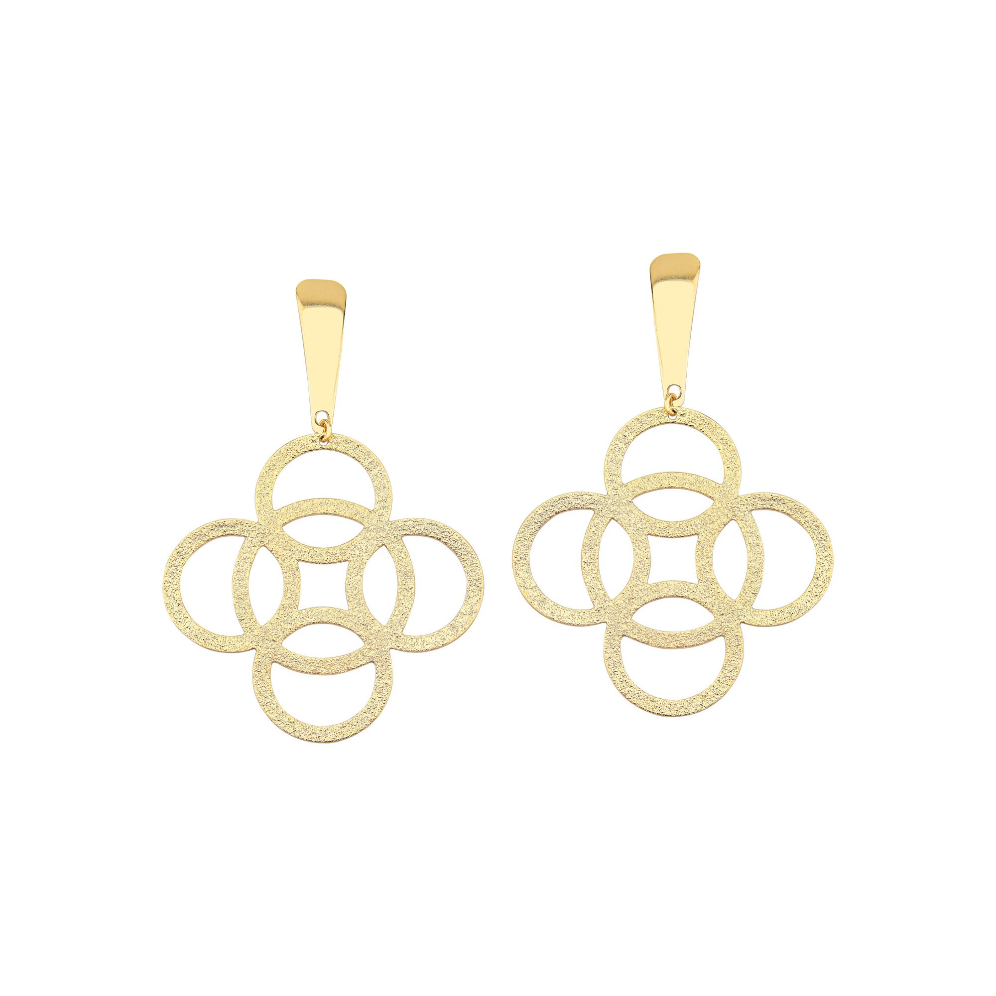 Elegância e sofisticação definem este brinco com círculos foscos entrelaçados. Seu design único combina o brilho do banho de Ouro 18K com o acabamento fosco, criando um contraste moderno e refinado. Perfeito para quem busca um acessório versátil e estiloso.