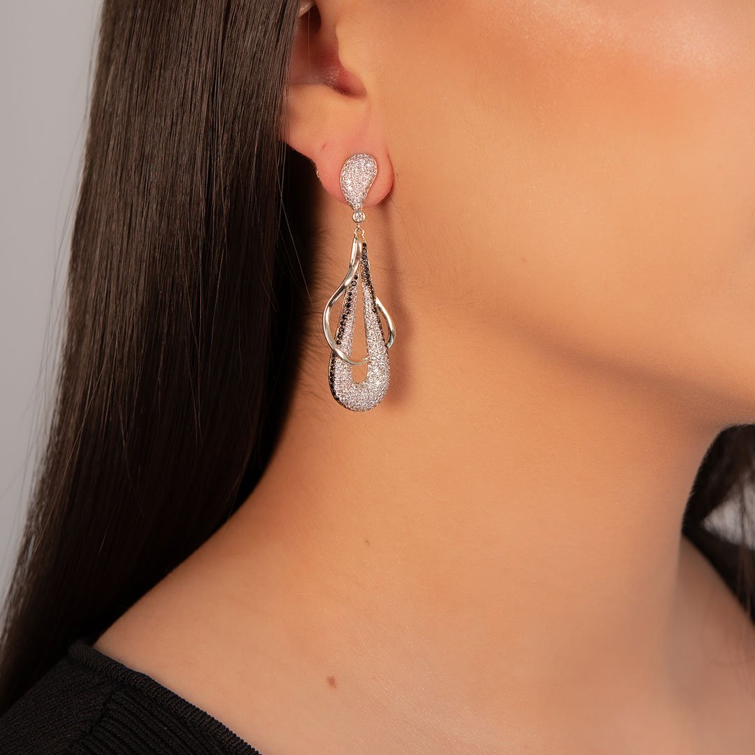 Brinco Comprido Cravejado com Zircônias Cristais e Negras