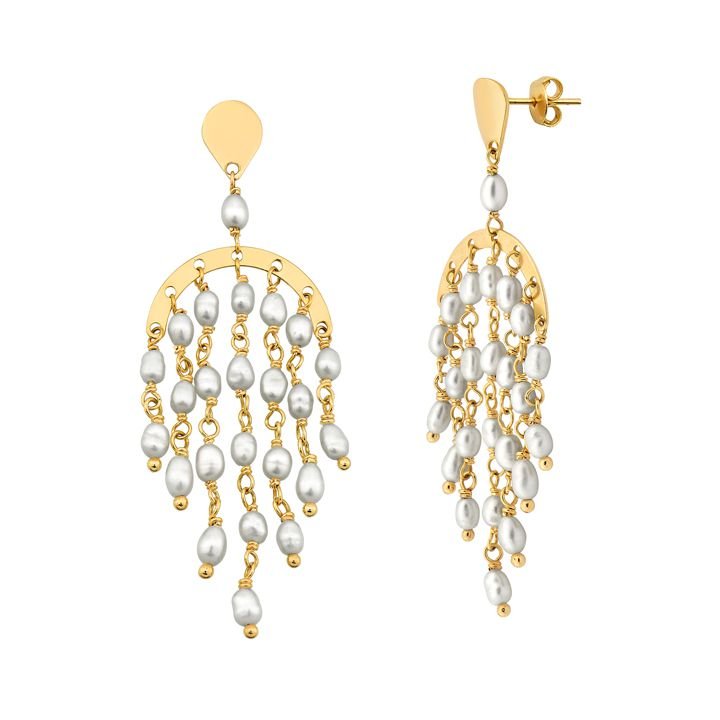 Este brinco comprido banhado a ouro 18k combina sofisticação e delicadeza. Com base em forma de gota e uma elegante cascata de pérolas cultivadas, a peça, com 6cm de comprimento, é a escolha ideal para quem busca um visual único e refinado.