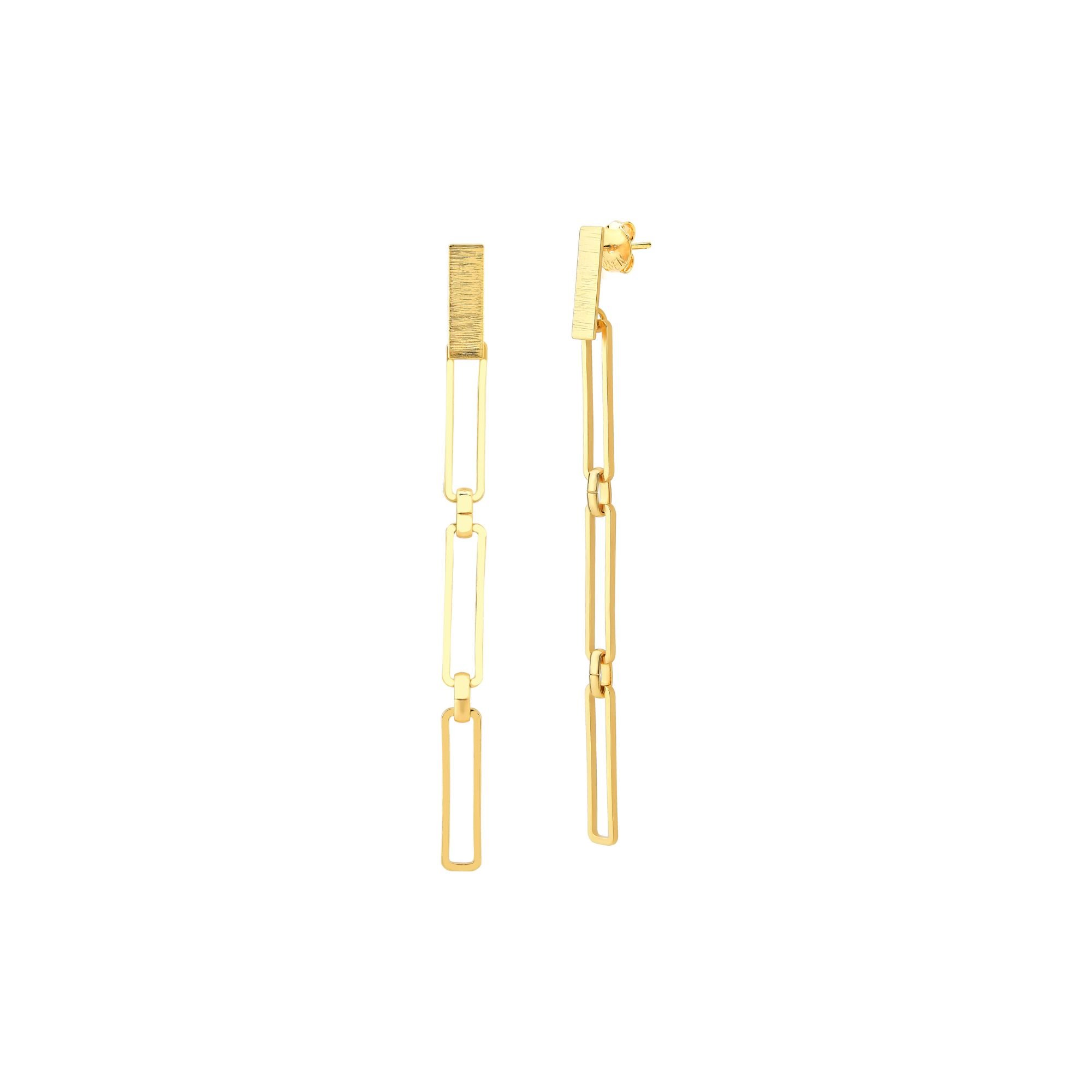 O Brinco High Summer banhado a Ouro 18K traz um design moderno e sofisticado, com uma base retangular e uma corrente de 8,5cm que adiciona movimento e estilo à peça. Perfeito para complementar o seu look de verão com muita elegância e charme.