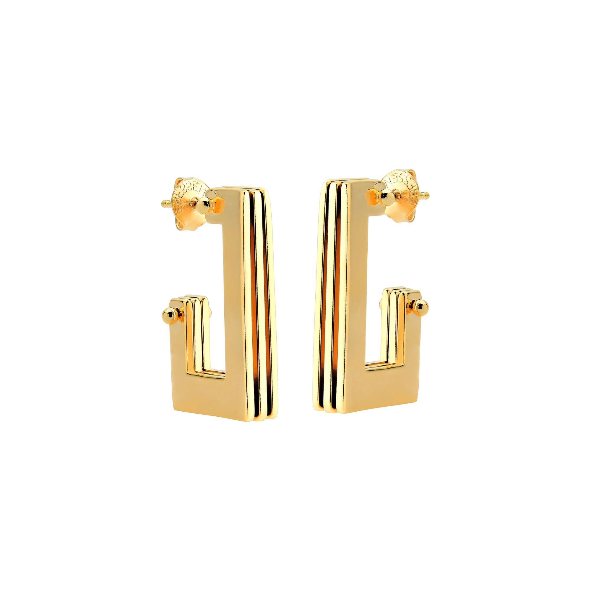 Este sofisticado brinco meia argola retangular banhado a ouro 18K possui um design detalhado e moderno, combinando elegância e estilo em uma única peça. Com 25mm, é perfeito para quem busca um acessório versátil e cheio de personalidade.