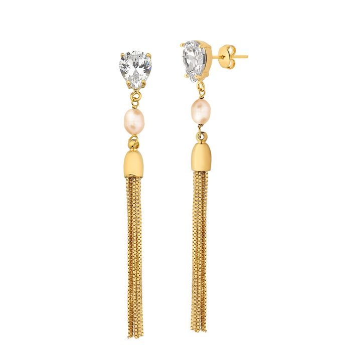 Este lindo brinco banhado a ouro amarelo 18K apresenta uma base de zircônia cristal em forma de gota, seguida por uma delicada pérola cultivada em água doce, com acabamento em franjas de corrente veneziana. Uma peça que une elegância e estilo, ideal para quem busca um visual sofisticado e atemporal.