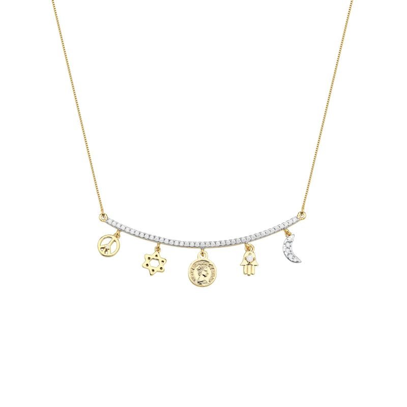 Místico e sofisticado, o Colar Canga Cravejada Pingentes Místicos Fressen Amuleto reúne símbolos de proteção e boas energias em um design elegante e luminoso. A base cravejada com zircônias realça o brilho dos delicados pingentes.