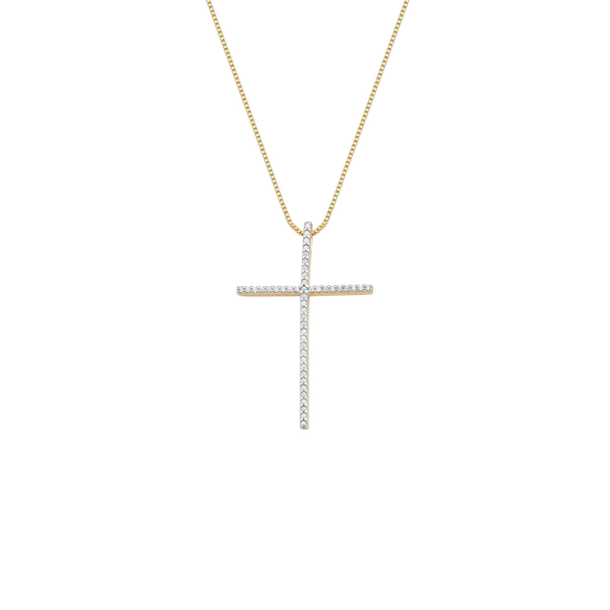 Colar Crucifixo Cravejado Fressen Moms Banhado a Ouro 18K Um clássico que nunca perde seu significado. O Colar Crucifixo Fressen Moms traz um pingente de cruz delicadamente cravejado, representando fé, proteção e espiritualidade com muito brilho e elegância.