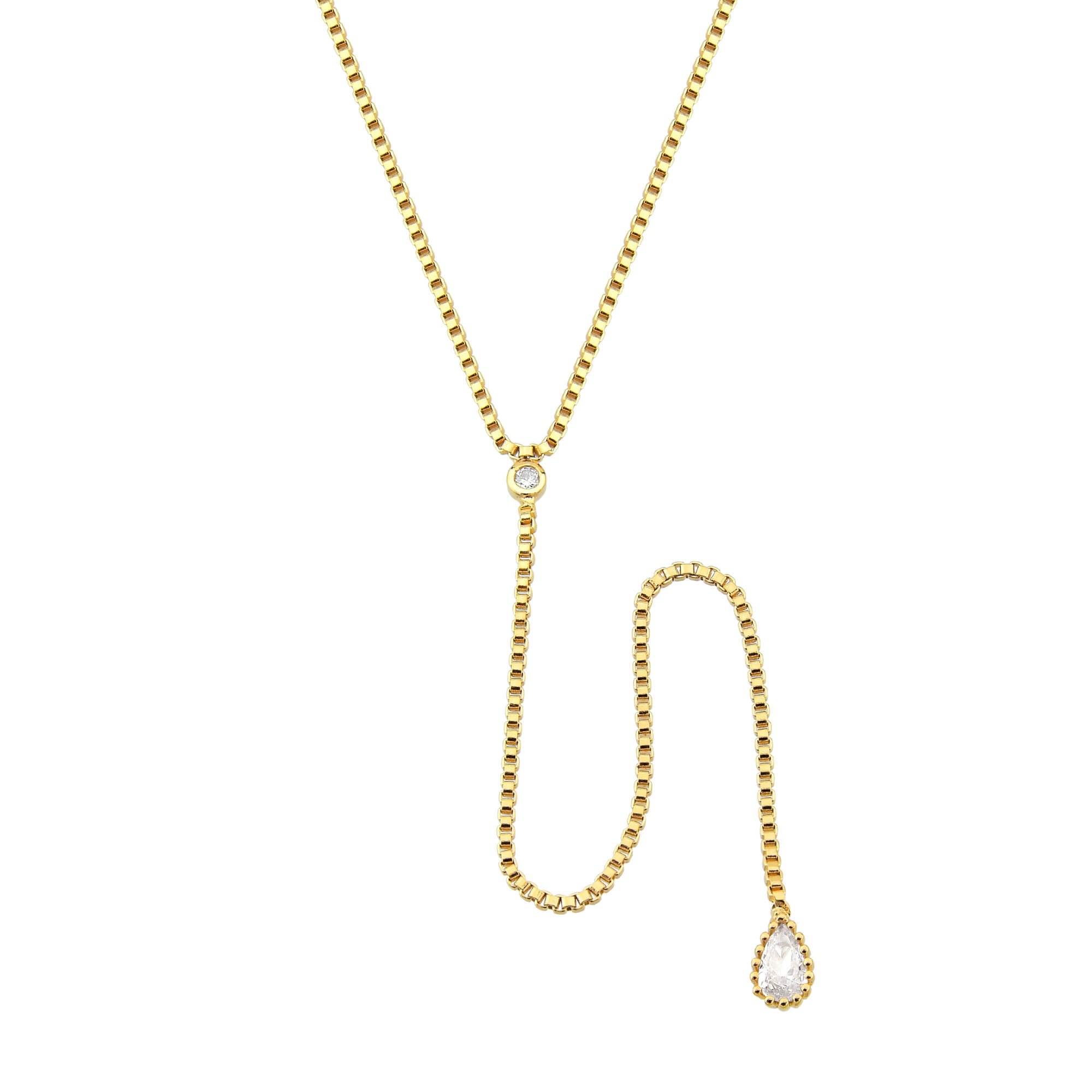 Este colar versátil Day to Night é a escolha ideal para quem busca elegância em qualquer hora do dia. Com um detalhe de gravata banhado a Ouro 18K, ponto de luz delicado e pingente em gota, ele se destaca pela sofisticação. A corrente veneziana de 40cm confere um acabamento refinado, perfeito para compor diferentes looks, do dia para a noite.