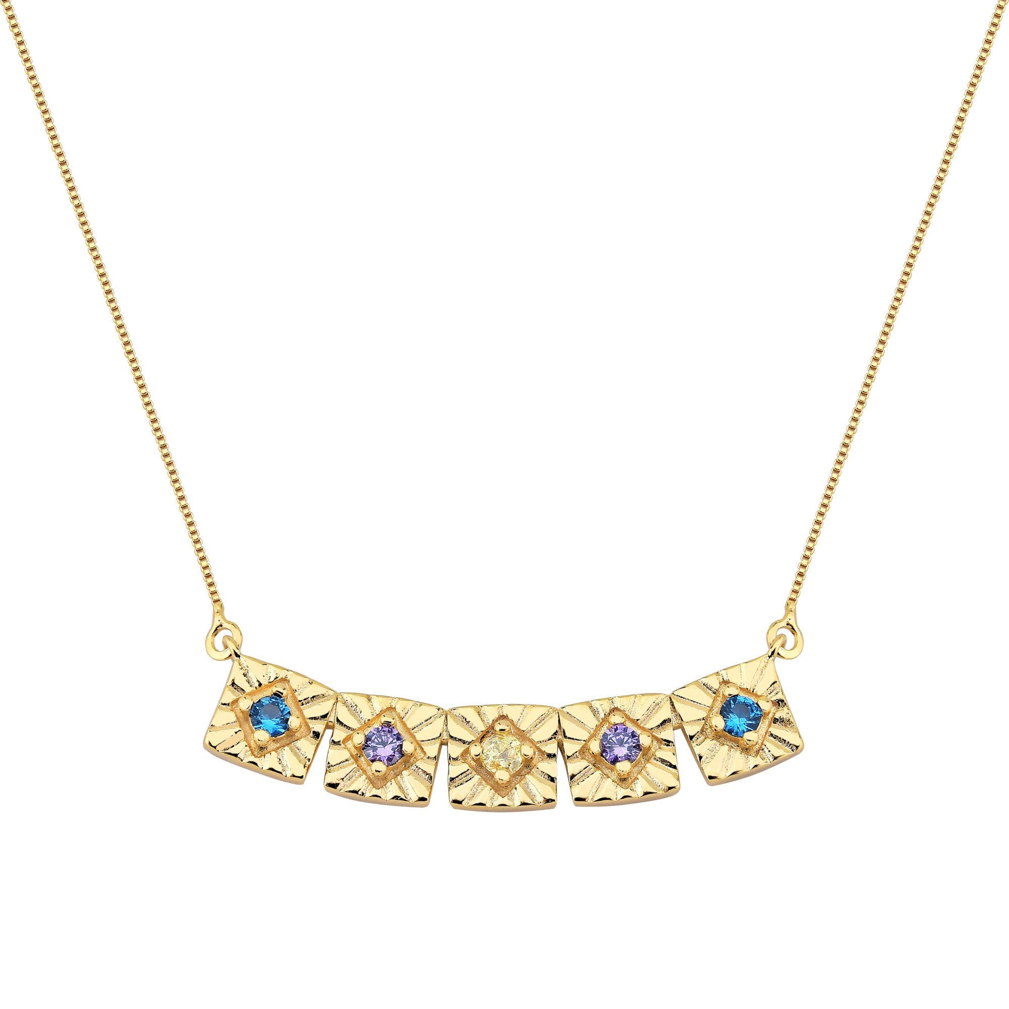 Colar Detalhe 5 Quadrados Cravejados Zircônias Coloridas Banhado em Ouro 18K Este colar banhado em ouro 18K apresenta um design encantador com 5 quadrados trabalhados, adornados por zircônias coloridas, que trazem um toque de brilho e sofisticação. Ideal para quem busca uma peça com estilo único e cores vibrantes, perfeita para dar vida e elegância ao seu look.