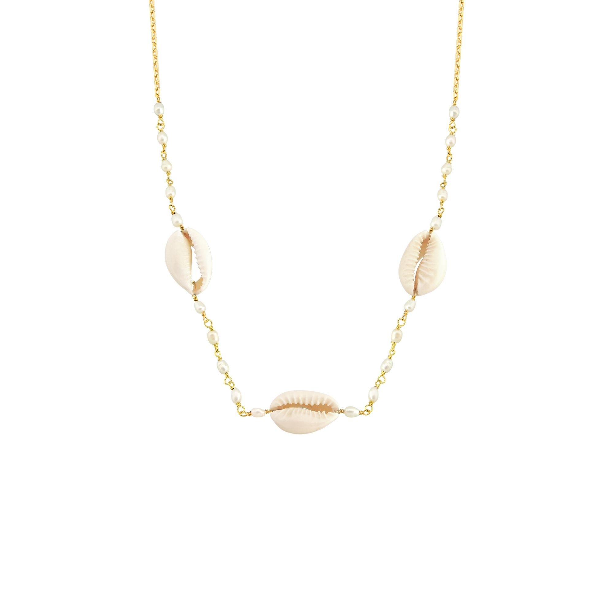 Colar Ocean Corrente Decorada Búzios Pérolas Banhado a Ouro 18K O Colar Ocean traz a beleza do mar com sua Corrente Decorada repleta de Búzios e delicadas Pérolas. Banhado a Ouro 18K, este colar é a escolha perfeita para quem busca uma peça que combine sofisticação e um toque natural inspirado na vida marinha.