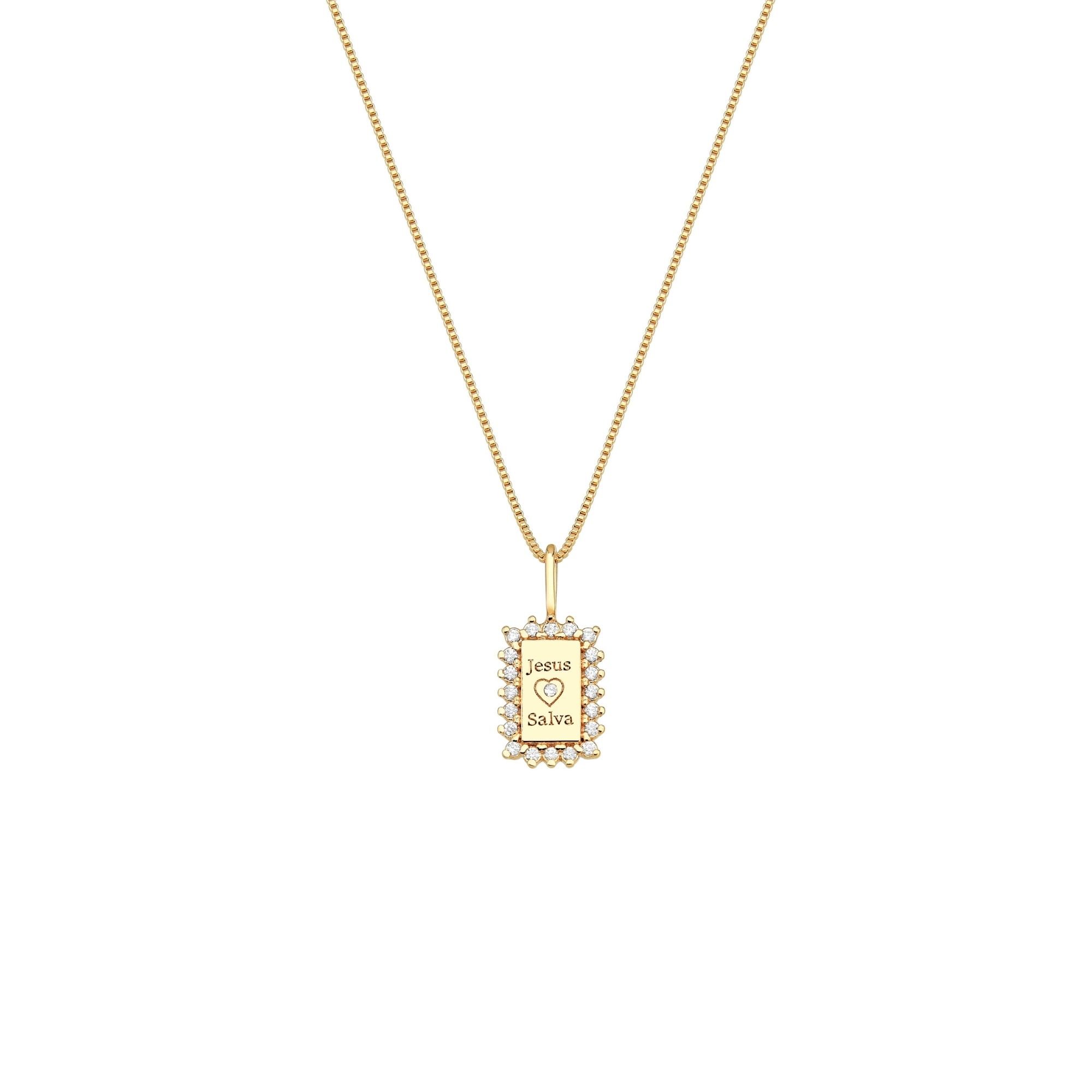 Colar Religioso Retangular Cravejado Banhado a Ouro 18K O Colar Religioso Retangular Cravejado é uma joia que expressa fé com elegância. Com um pingente retangular ricamente cravejado por zircônias e detalhes que ressaltam o símbolo sagrado em alto-relevo, ele transmite delicadeza e significado em cada detalhe. Banhado a ouro 18K, oferece brilho e sofisticação atemporais, sendo ideal para quem busca um acessório marcante e cheio de propósito. Sua corrente fina e delicada complementa o visual com sutileza e leveza.