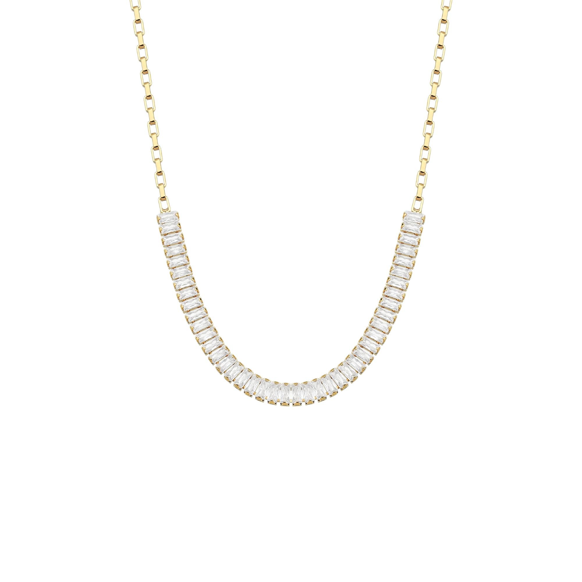 Colar Riviera Baguete e Cartier - Banhado a Ouro 18K Duas joias em uma peça marcante. Este colar une a sofisticação da cravação baguete, inspirada nas clássicas rivieras, com a elegância atemporal dos elos Cartier. Um design moderno e poderoso, banhado a ouro 18K, ideal para quem busca presença e brilho em cada detalhe.