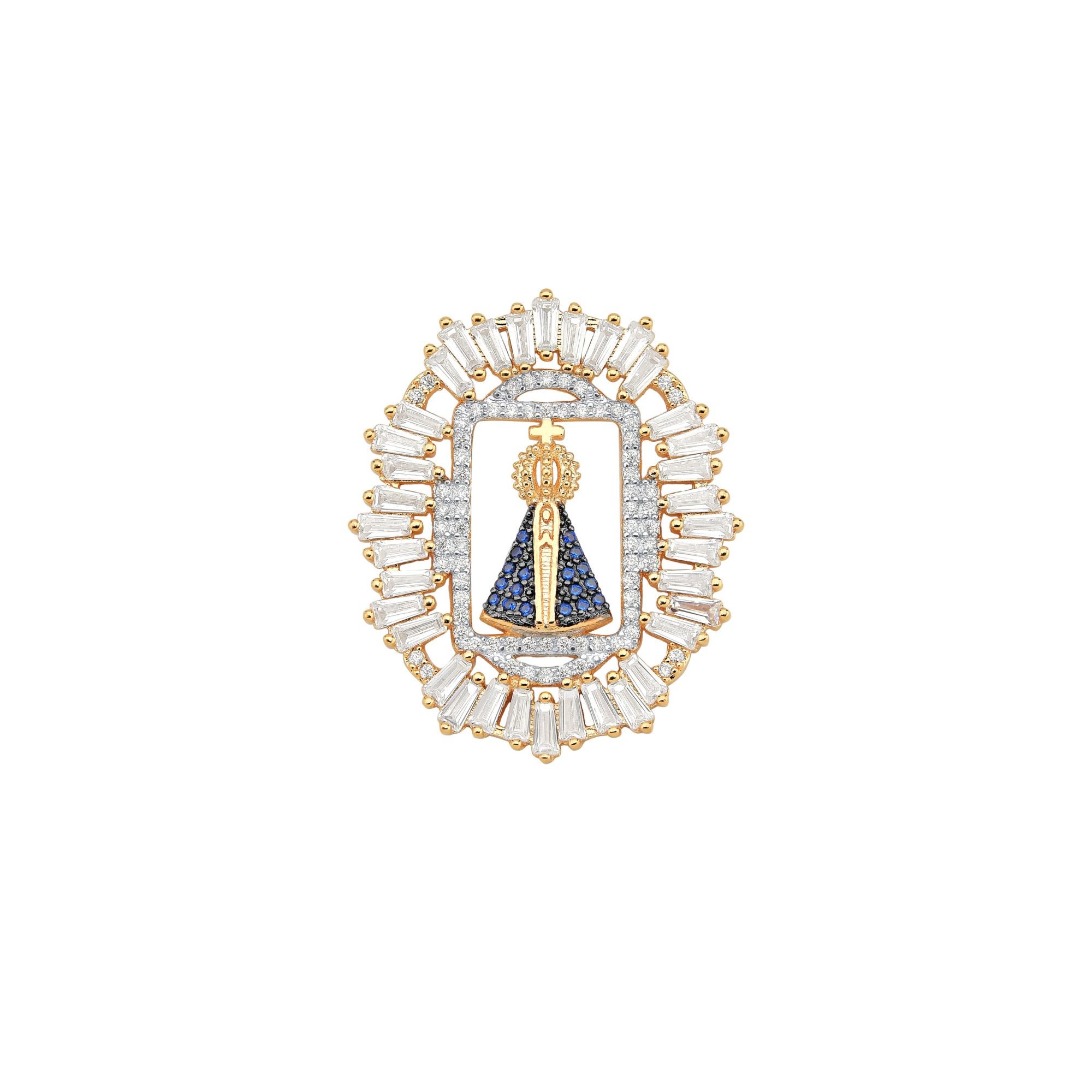 O Pingente Oval de Nossa Senhora é uma peça que encanta pela simbologia e pelos detalhes. Banhado a Ouro 18K, seu design clássico emoldura a imagem sagrada com um brilho especial: delicadas zircônias navete, que trazem sofisticação e elegância à peça.